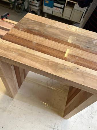 Nach dem Verleimen der ersten Teile – mit tatkräftiger Unterstützung durch die Klemmen – ging es in eine wohlverdiente Frühstückspause mit frischem Brot, Schinken und Käse vom Münsteraner Wochenmarkt. Gestärkt arbeiteten wir weiter: schleifen, sägen, auf Gehrung schneiden und schließlich alle Einzelteile zum fertigen Hocker zusammensetzen.